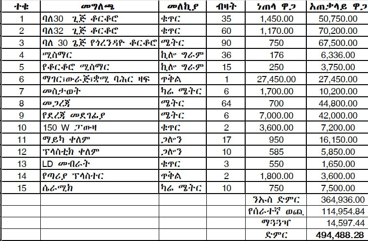 5. የጉባኤ ቤቱ መረቃ በሰሜኑ ጦርነት ምክንያት እስከአሁን አልተደረገም። ይኽንንም ከተማሪዎች ምረቃ ጋር ለማድረግ ታስቧል። በጦርነቱ ወቅት ህንጻው ጉዳት ደርሶበት ነበር። እንዲሁም የአልተጠናቀቁ ስራዎችን ጨርሶ የእናንተ የጉባኤ ቤቱ ቤተሰቦች ድጋፍ የአስፈለጋል። የወጪው ዝርዝር እንደሚከተለው ቀርቧል።